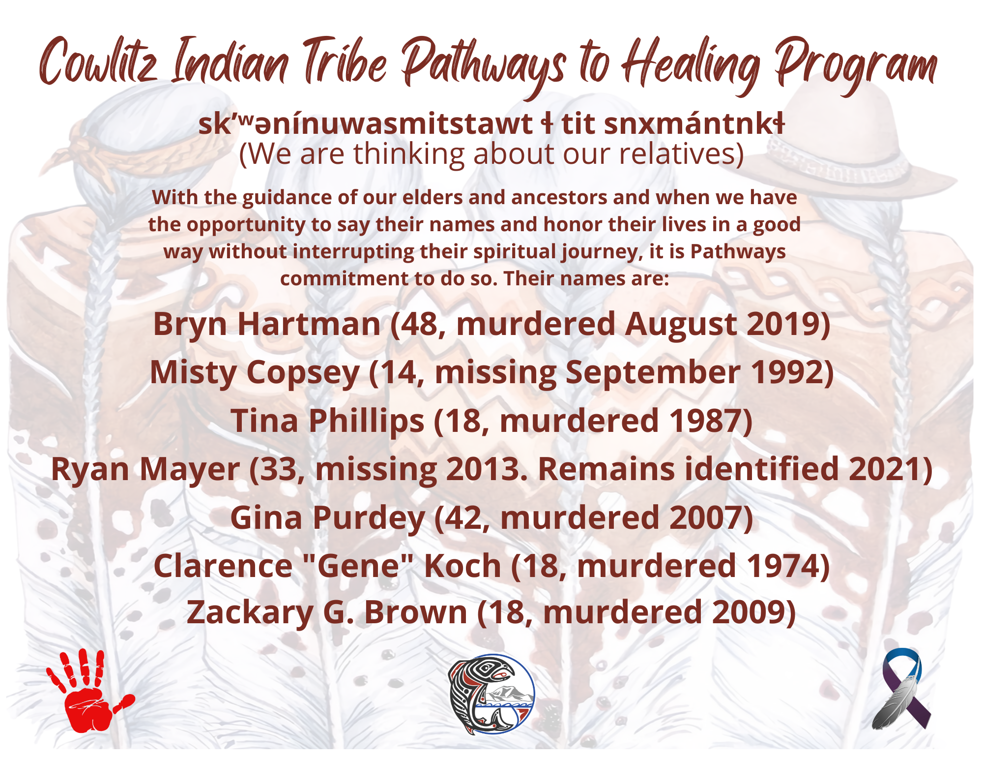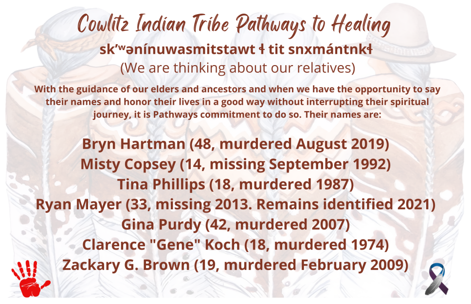 All services are confidential and available to all gender identities of all ages who is an enrolled member of a Tribe or descendant of a Tribal member, services to Cowlitz Tribal members are available regardless of where you live. While the PTH Program recognizes that a person can be both a survivor and a perpetrator over the course of their life, the focus of participation in services must be exclusive to the effects of the victimization.
